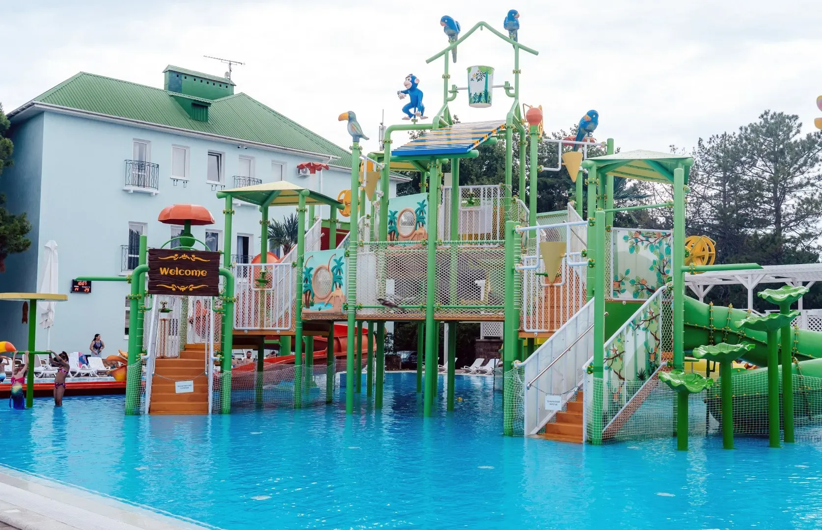 При благоприятных погодных условиях для детей работает новый акваплей - открытый подогреваемый детский бассейн с водными аттракционами 6+