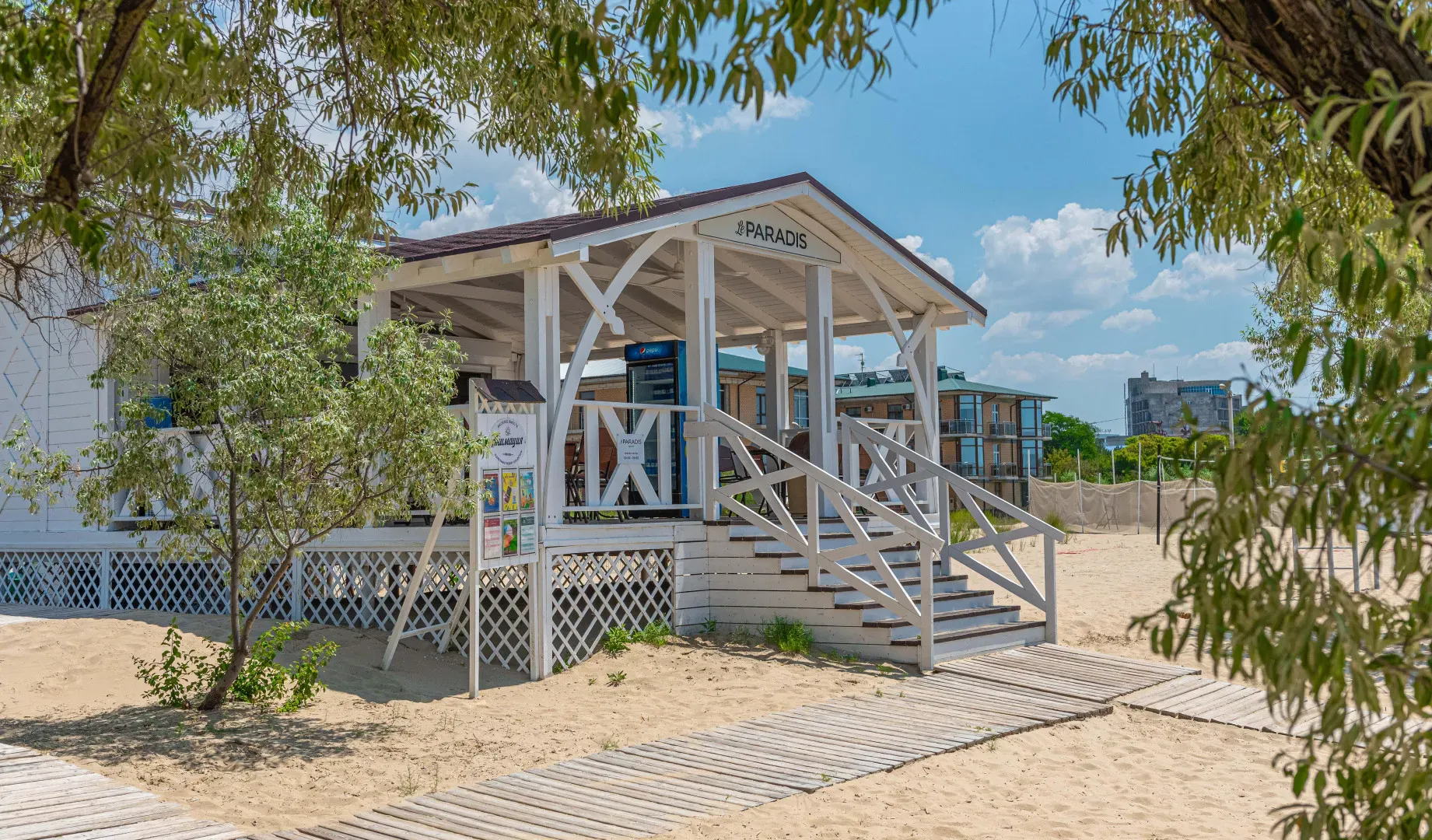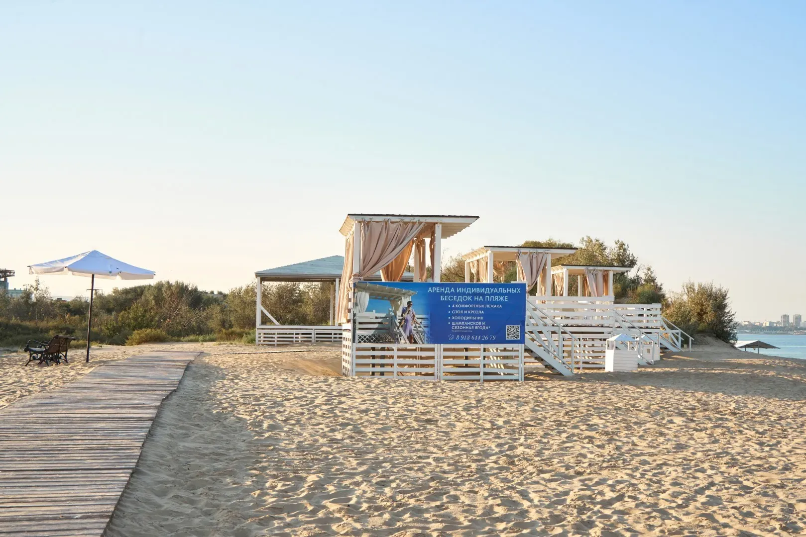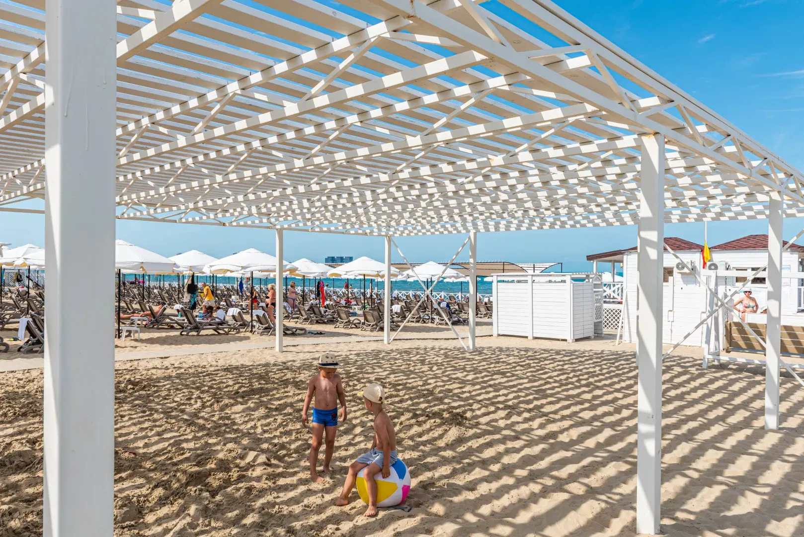 Из развлечений на пляже гостям доступны: детская игровая площадка, площадка для волейбола, сцена для анимационных мероприятий, прокат водного инвентаря, сап-досок.
