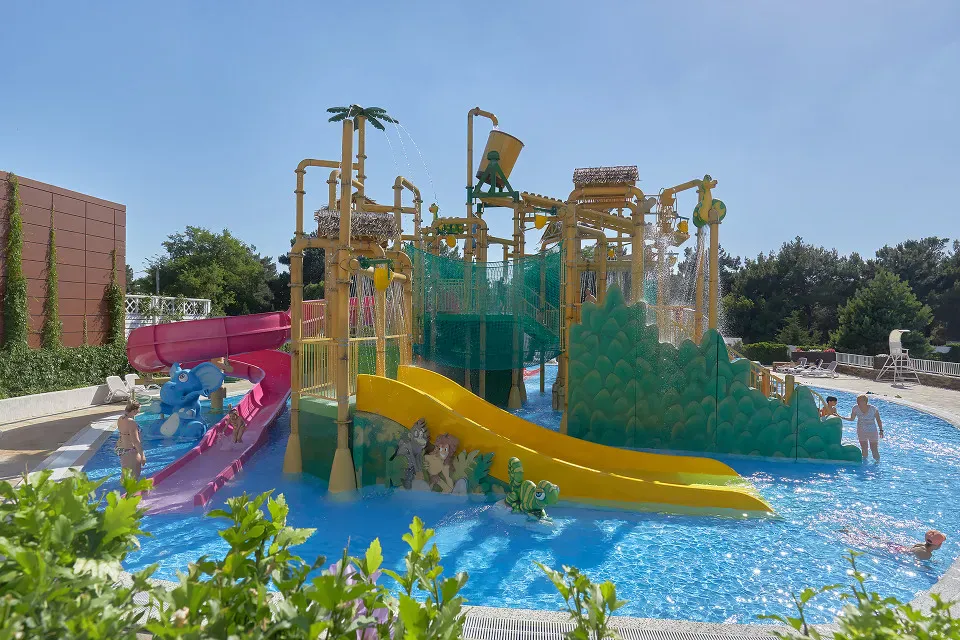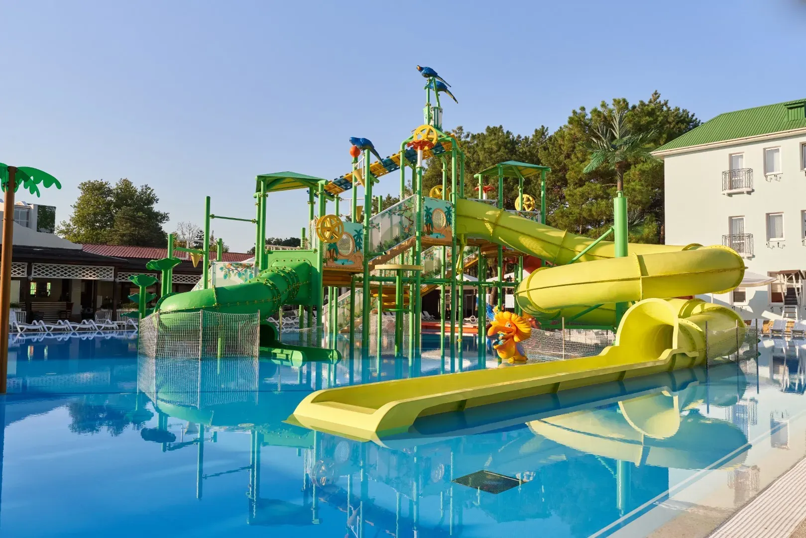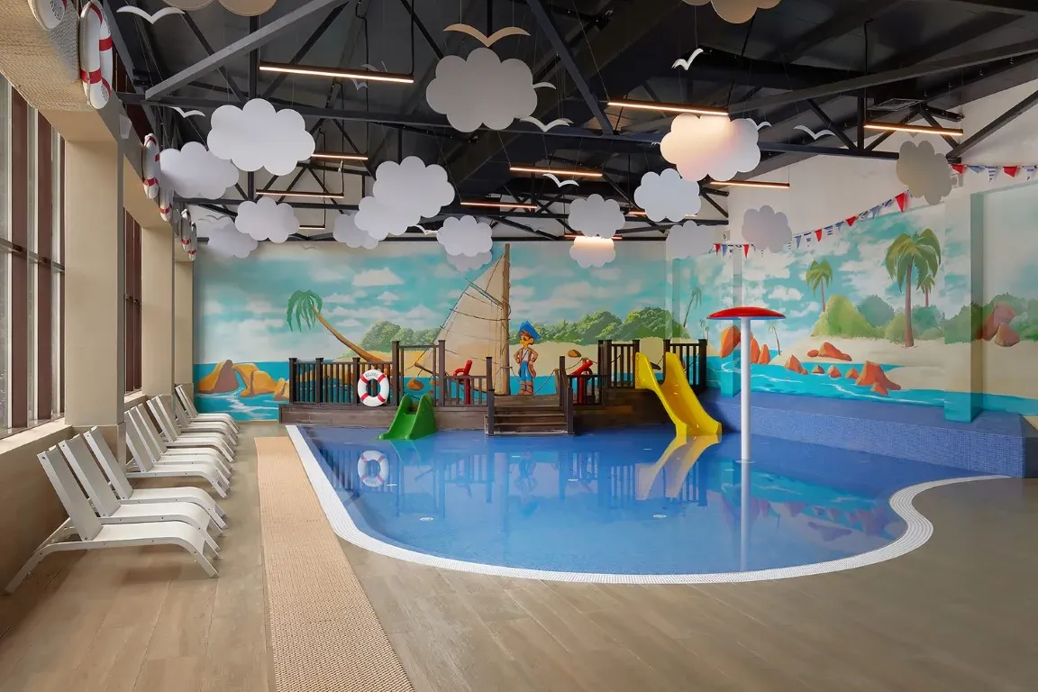 Комплекс детских бассейнов состоит из трех зон. Самым маленьким подойдет бассейн для водных развлечений с мини-горками «Осьминог». Есть отдельный бассейн для купания с теплой водой. А также особенное внимание юных гостей привлечет оригинальный интерактивный многоуровневый аквапарк с лабиринтами, водопадами, горками и игровыми элементами.