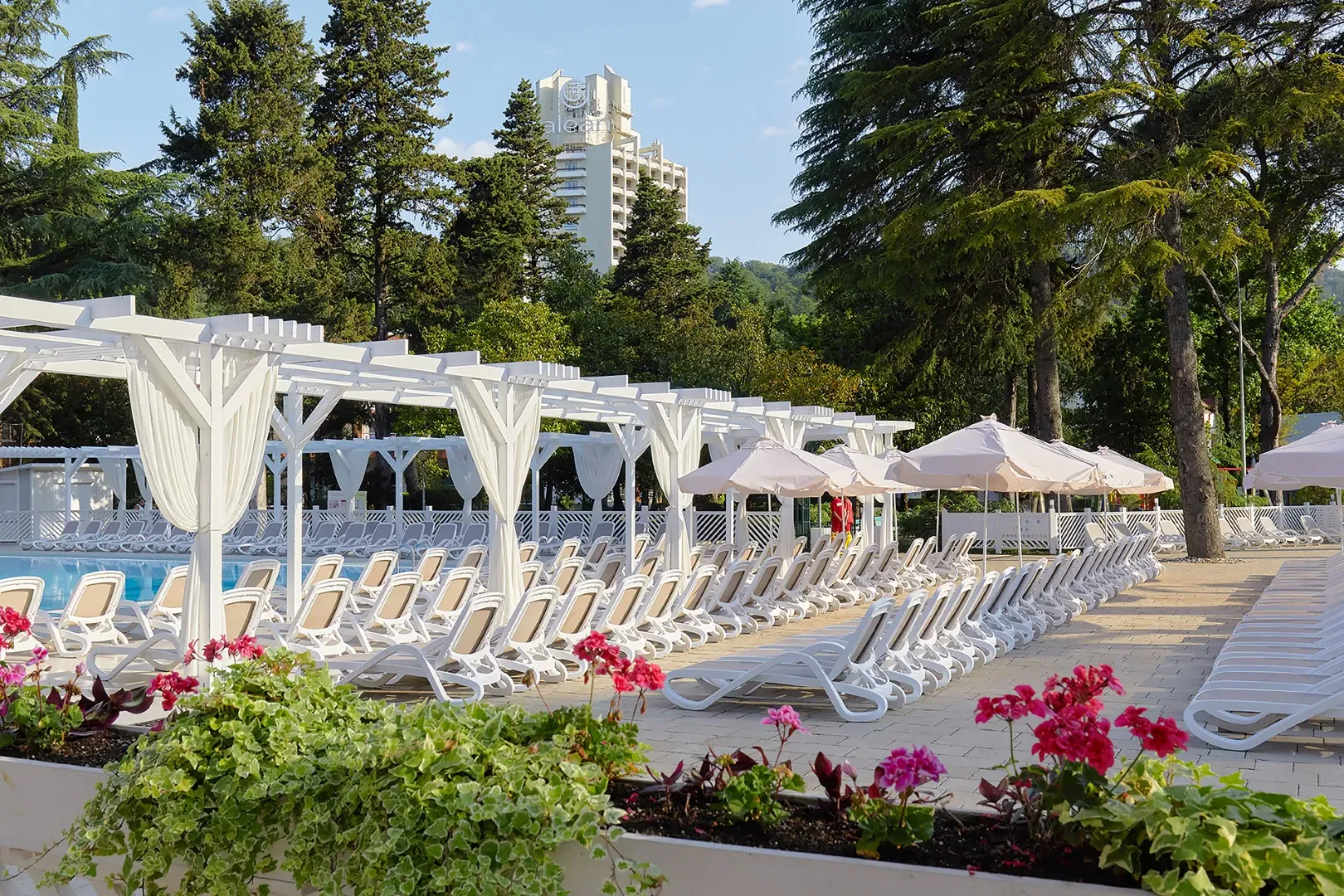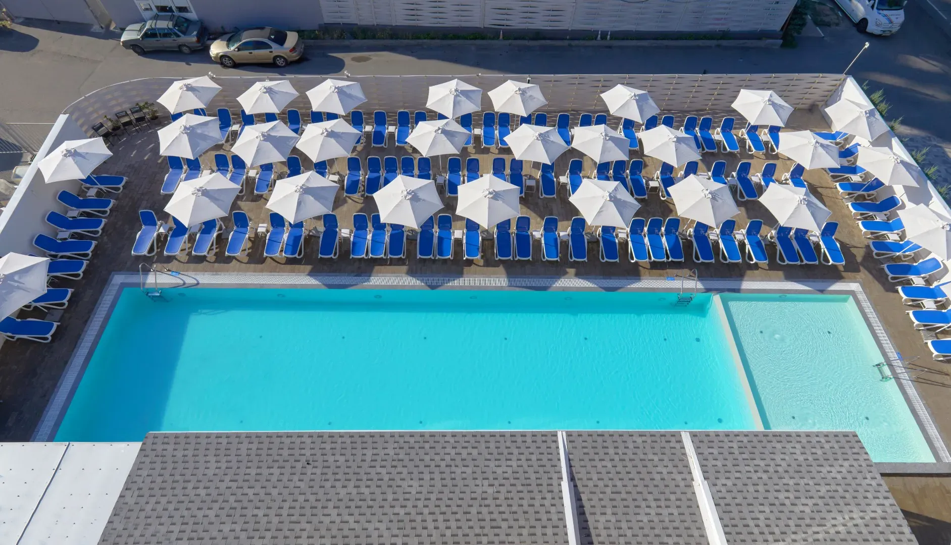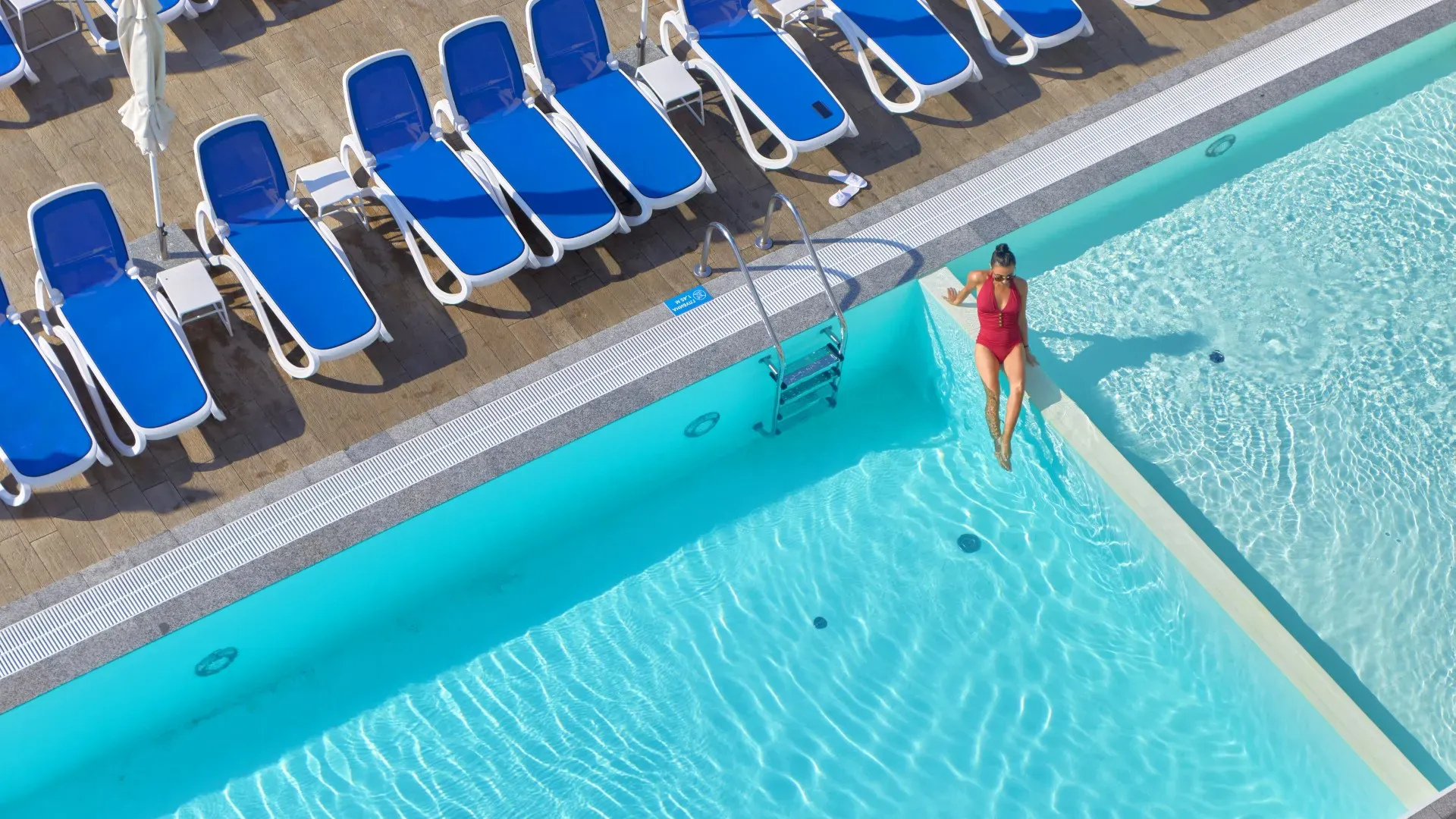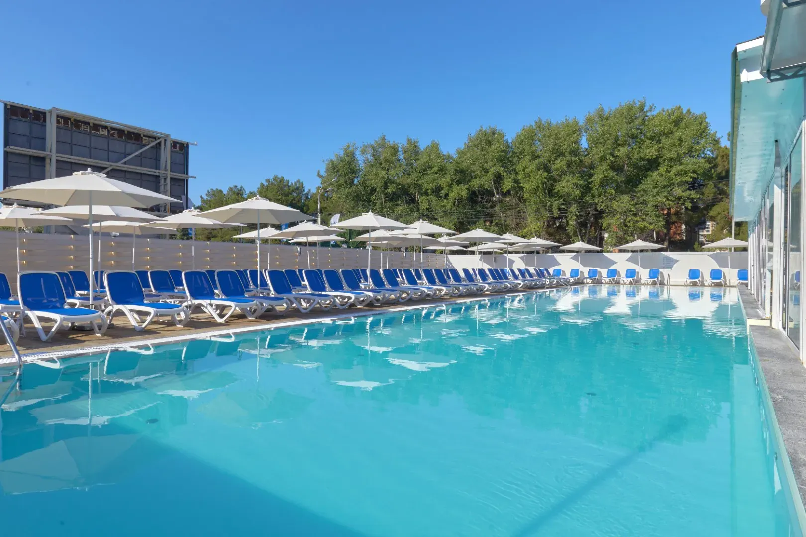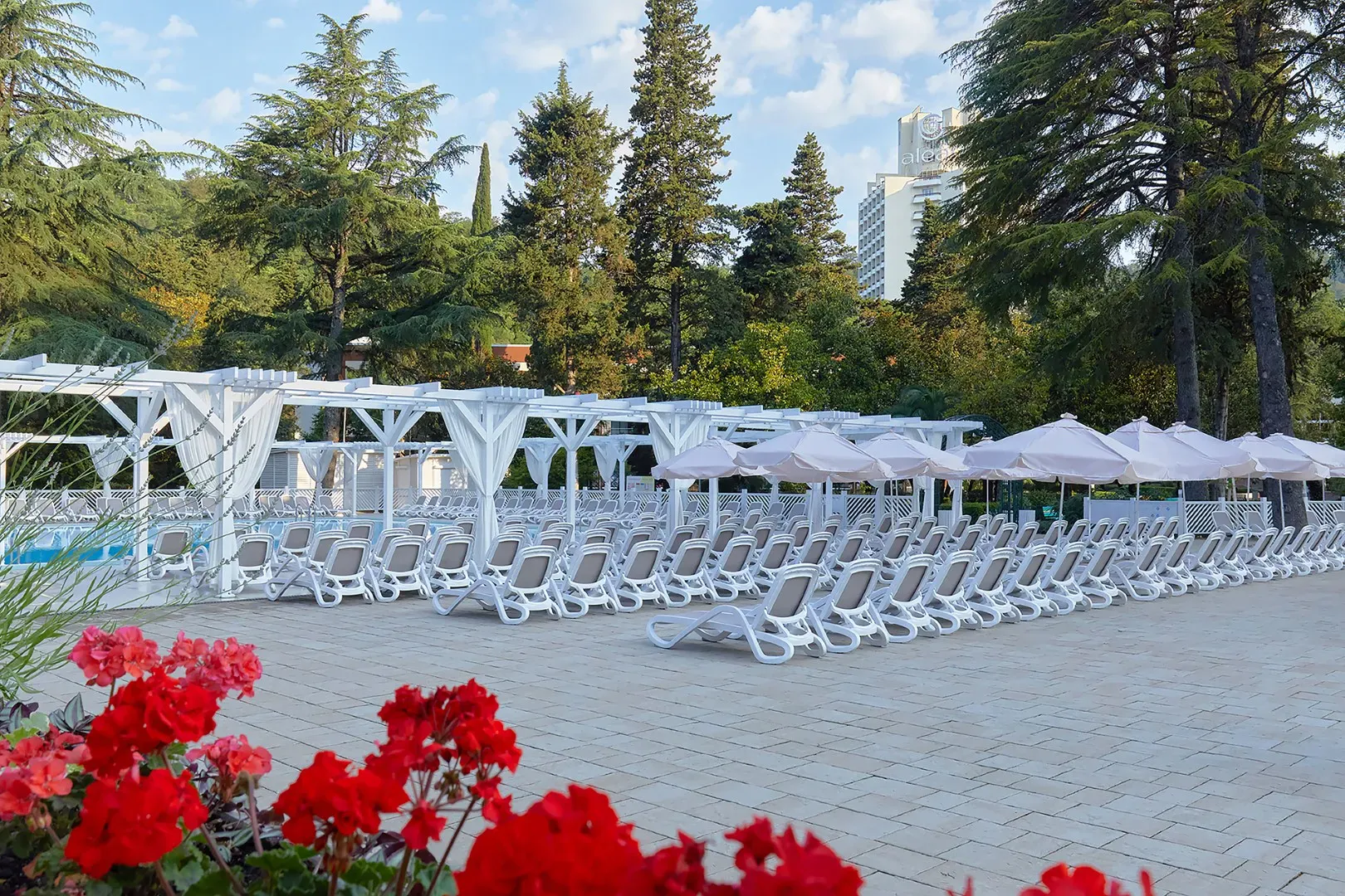 По периметру бассейна установлено более 80 шезлонгов с зонтами и столиками, а также оборудована специальная зона для более уединенного отдыха.
