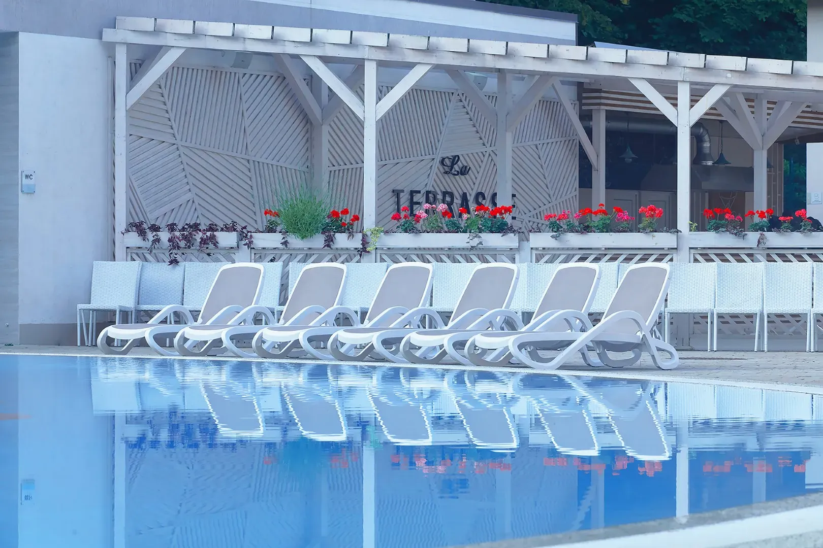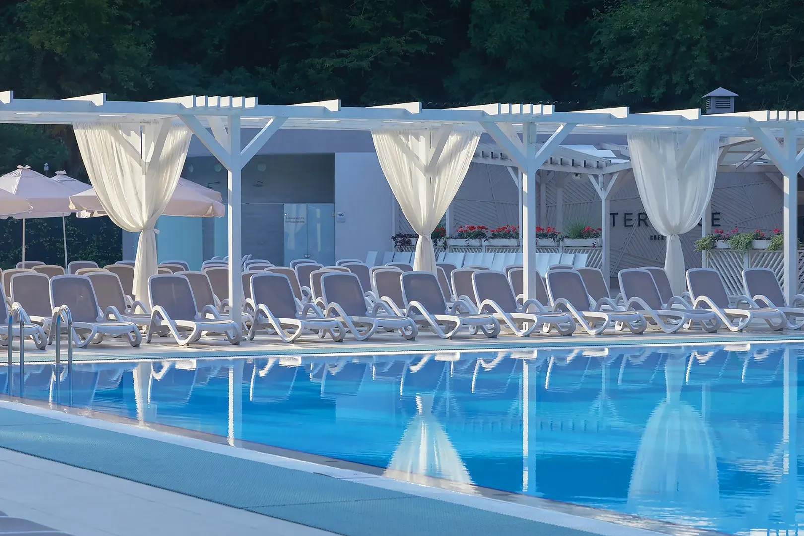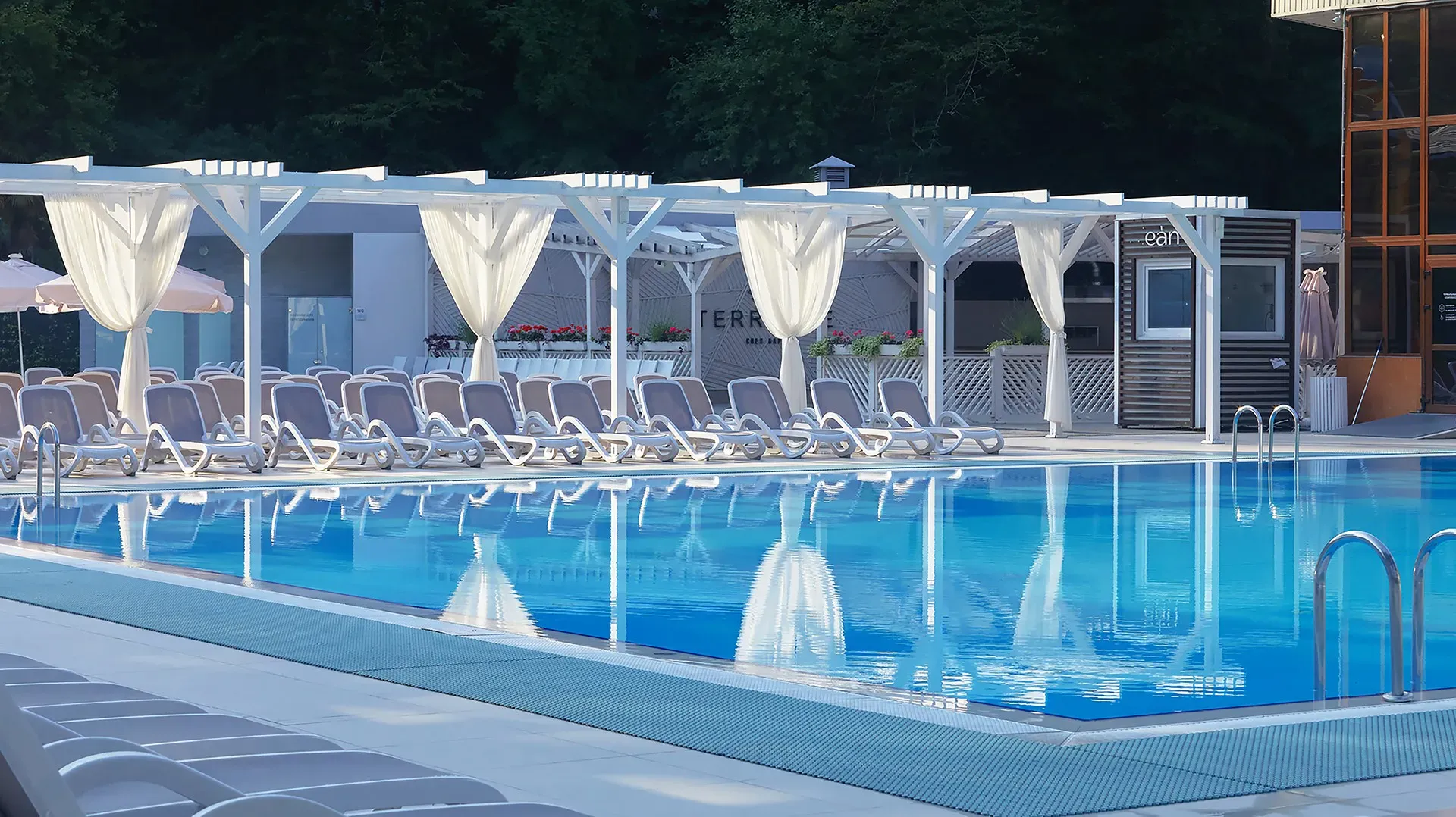 Круглогодично в плавательном бассейне поддерживается температура +26 - +28 C, что позволяет не отказываться от водных процедур даже зимой. Для удобства гостей вокруг бассейнов расположены шезлонги с замечательным видом.