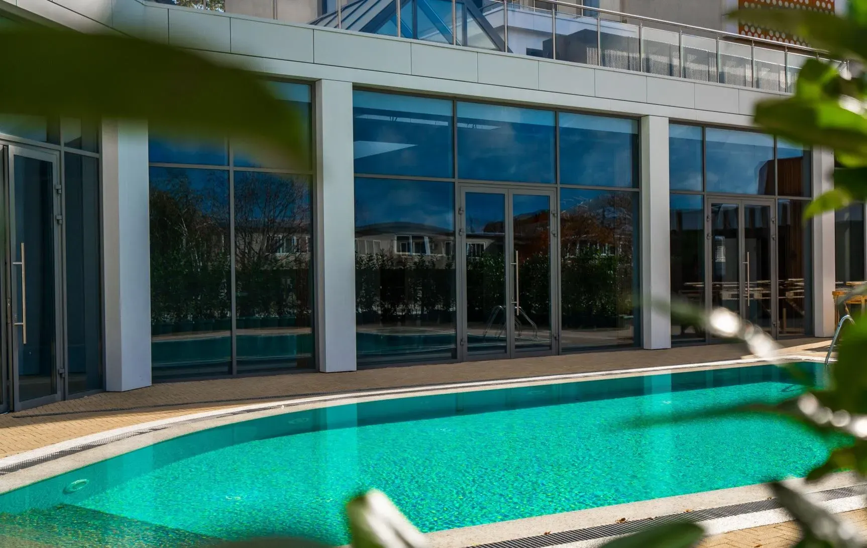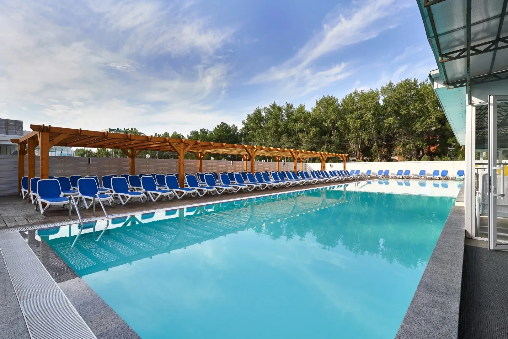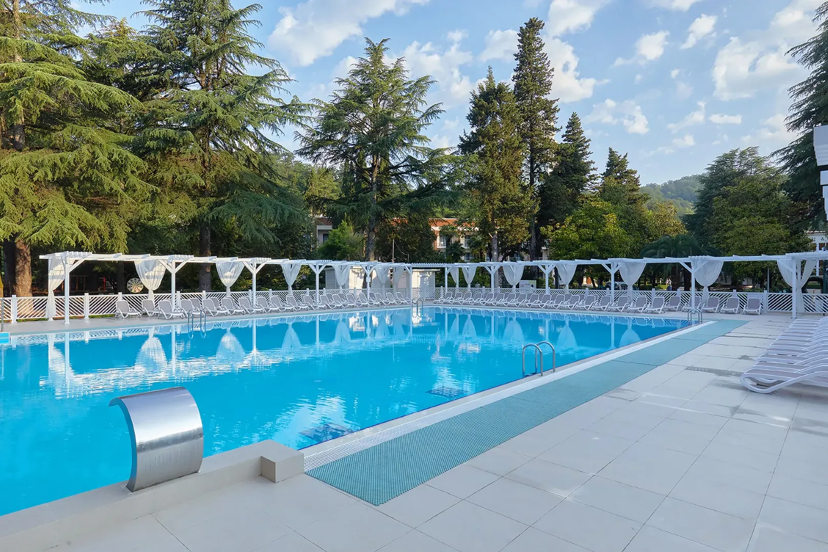 Круглогодично в плавательном бассейне поддерживается температура +26 - +28 C, что позволяет не отказываться от водных процедур даже зимой. Для удобства гостей вокруг бассейнов расположены шезлонги с замечательным видом.