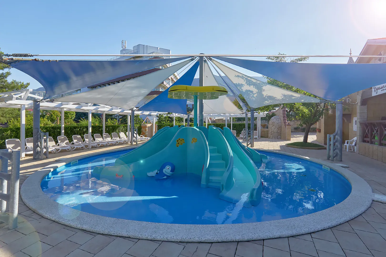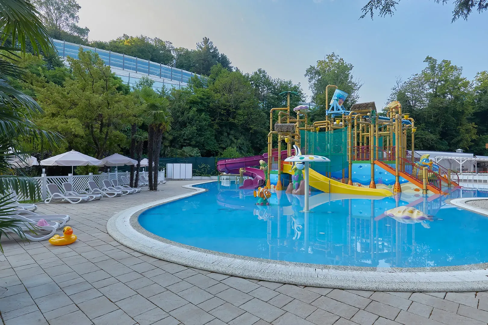 Крытый детский бассейн располагается в здании Термального комплекса отеля. Кристально чистая вода подогревается, ее температура поддерживается в границах 25-27 градусов.