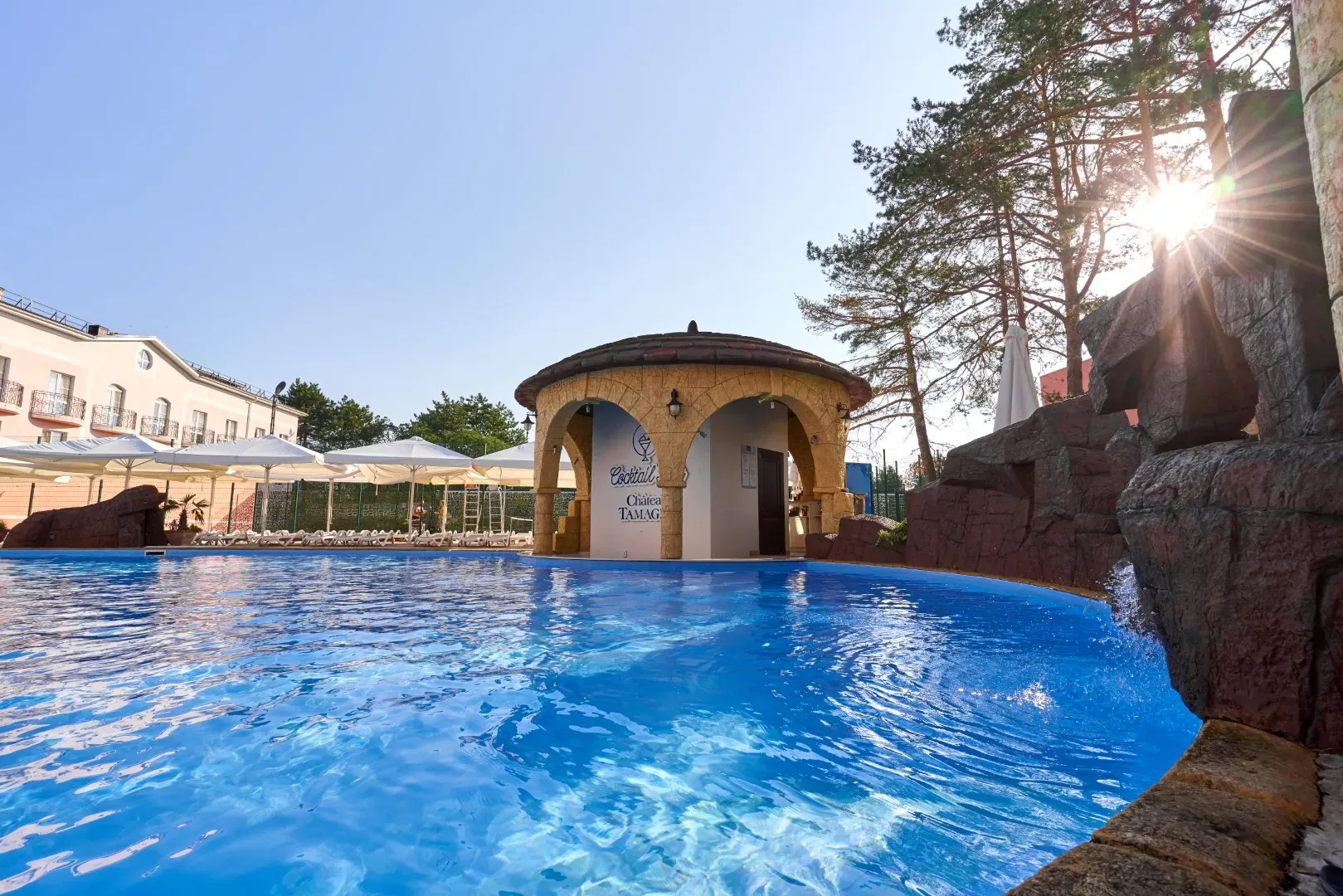Бассейн отеля расположился под открытым небом и имеет постоянную комфортную температуру для плавания 22-26 градусов.
