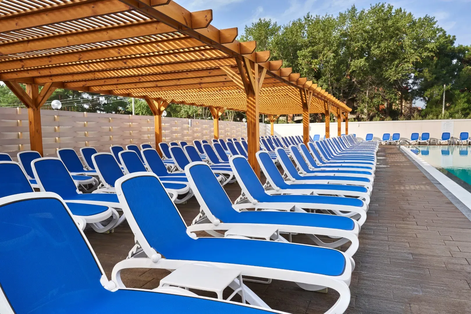 Вдоль периметра бассейна установлено более 80 шезлонгов с зонтами и столиками, а также предусмотрена специальная зона для уединенного отдыха. Для удобства гостей бассейн разделен на две части: взрослую и детскую.