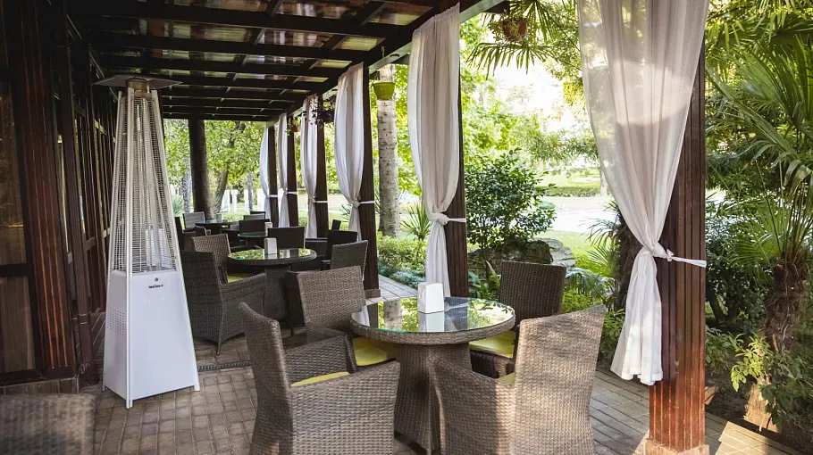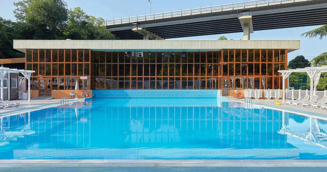 Круглогодично в плавательном бассейне поддерживается температура +26 - 28 °C, что позволяет не отказываться от водных процедур даже зимой. Для удобства гостей вокруг бассейнов расположены шезлонги с замечательным видом.